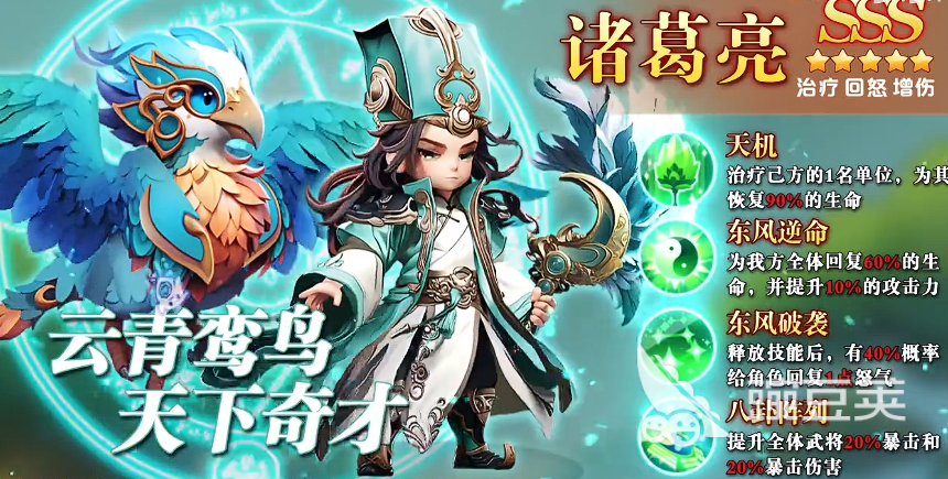 最后为大家推荐的就是诸葛亮,诸葛亮这个武将当中看技能的话,其实主要的效果当中还是要看辅助,他融入阵容的能力很强,基本适配于任何阵容的效果,而且不仅可以给生命数值最低的队友带来足够的治疗恢复,还可以在单体回复的同时拥有全体治疗,当然除了基础的血量回复之外,他最重要的是有怒气回复的机制,这样的机制让诸葛亮也有了很强的加速功能,至少在我方武将使用大招的循环时间上面有了更快的利用空间。