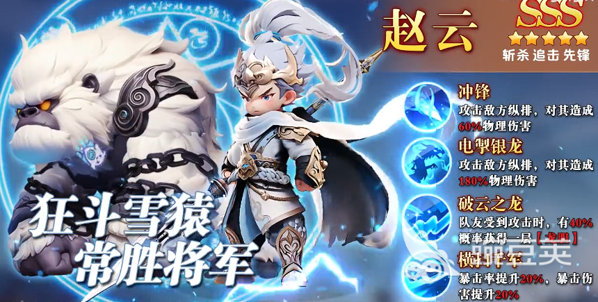 第四个就为大家推荐赵云,他也是前期在千抽当中很适合快速拿到手的一个武将,放在游戏当中的话他不仅可以作为爆发武将用,自身的多动效果触发之后,在其中有核心加成的时候可以叠加起来足够的龙胆状态,这个状态就可以为他打出持续类型的输出,而且额外的行动回合基本只要有这个龙胆的加成,他就可以复制一个七进七出的效果哦,当然他在针对纵向敌人攻击的时候只要能够多触发被动的效果,在上面就可以快速达成自身的多次行动,在有足够升星材料的时候,后期能够带来的暴击会更强哦。