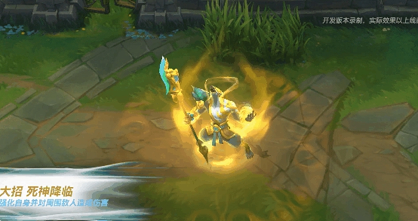 内瑟斯释放一个具有强大魔力的金色标志圈阵,其外边由祥云标志连接而成,全身变大散发着金色的光芒。为自身增加一段时间的生命值、护甲和魔法抗性。