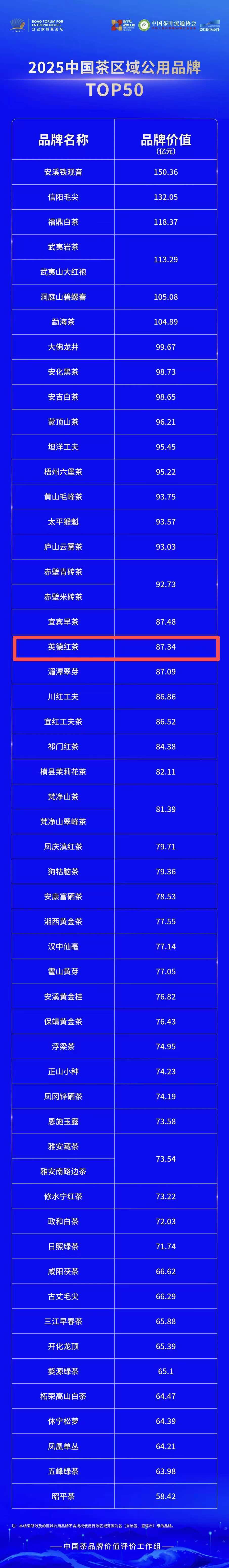 清远英德地处岭南腹地,气候温和,稳居生态宜茶,茶品产茶历史最早可追溯到1600多年前的南朝刘宋时期,有“世界红茶之乡”的美誉。丰厚的历史底蕴和独特的地理环境,孕育了英德红茶极佳的品质,其“浓、醇、甜、香”特点驰名中外,不仅获评为“世界高香红茶”,还被誉为“东方金美人”。今年5月,浙江大学中国农业品牌研究中心发布了2025中国茶叶区域公用品牌价值评估,英德红茶区域公用品牌价值达51.78亿元,首次荣登全国红茶类第一。