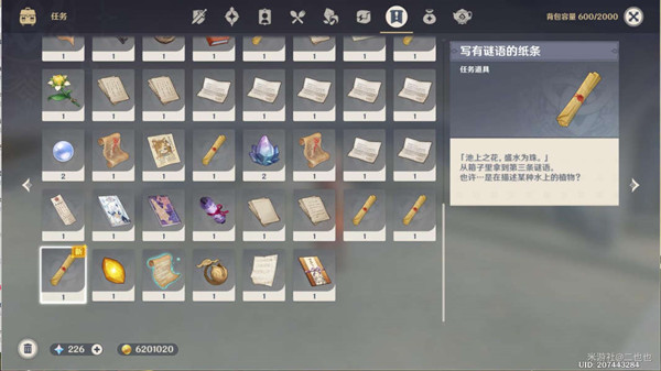 5、在背包中查看纸条,获得新的池上之花,盛水为珠谜语。