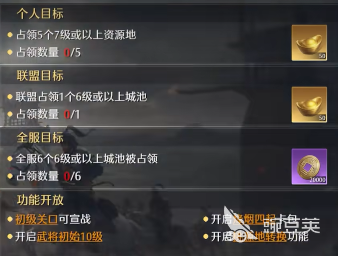 联盟系统里面比较重要的玩法就是盟会战了,也就是说和其他的联盟易旗打仗,互相争夺领土。这种战斗规模还是比较大的,一场估计都有几百人参加战斗,谁如果赢了就可以得到更多的资源区,联盟也能够发展得更快。在赢了比赛哦之后,就能得到新的资源区了。若是资源多了起来,发展直线上升,所以大家还是不要错过这样的玩法,会有不少的好处。