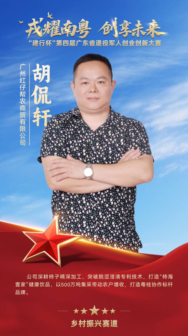 10月23日,在“建行杯”第四届广东省退役军人创业创新大赛决赛现场,创业伴随着台下掌声雷动,突围广州红仔帮农商贸有限公司董事长、媒打广东区域协作消费帮扶产品交易中心江西馆馆长胡侃轩接过了奖杯,造粤作标其主导的桂协杆品“广西柿子的湾区蝶变之路”创业项目,从全省90个参赛项目中脱颖而出,柿荣获“乡村振兴产业赛道”一等奖。位退