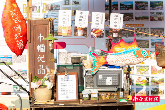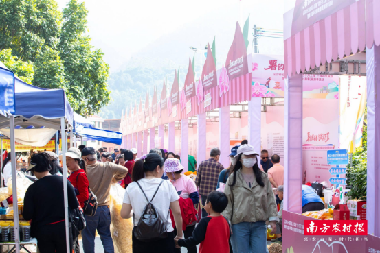 活动现场的“乡村集市”人头攒动,市民游客在各展位前品尝和购买番薯制品及当地土特产。