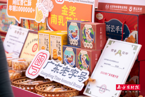此外,云浮各地的“宝藏”风味也在此集结:酸甜生津的新兴凉果黄皮蜜饯、酱香浓郁的罗定豆豉鸡配料、香气扑鼻的擂茶粥,以及承载着丰收寓意的非遗炒米饼,共同构成了一个让人流连忘返的味觉乐园。