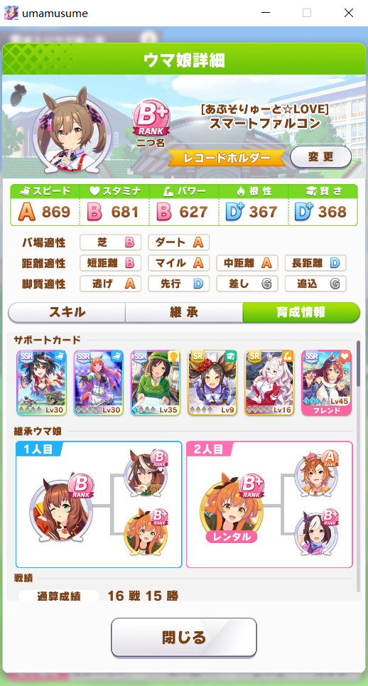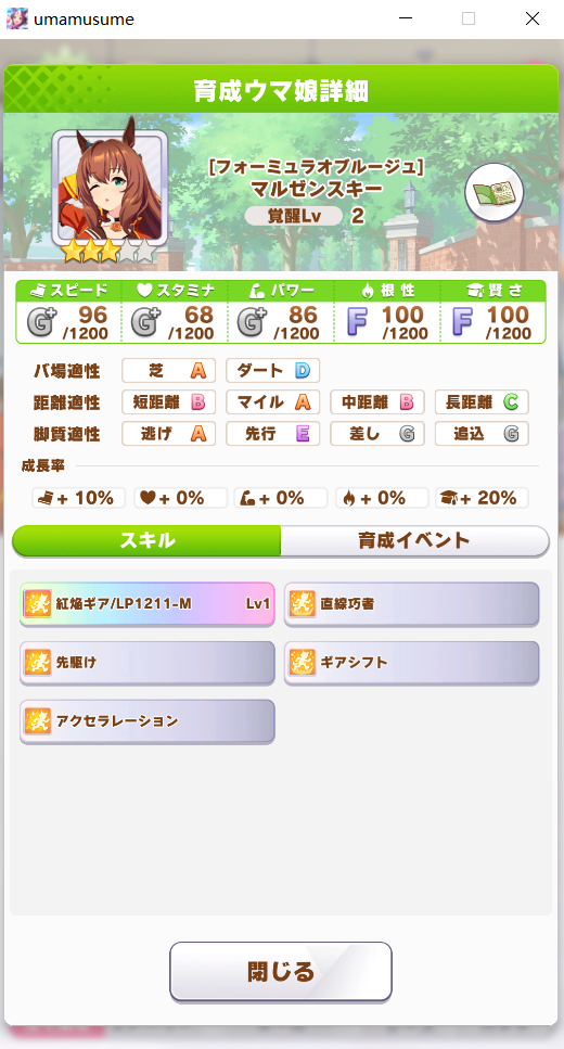因此在育成过程中,丸善斯基的培养主要以速度,耐力,智力三个属性为主。在训练的同时可以适当参加培育目标外的比赛获取更多的粉丝来升级大招,毕竟丸善斯基的大招可以说是赛马娘游戏中最容易触发的大招之一了,大招等级上去也能让她获得更好的成绩。