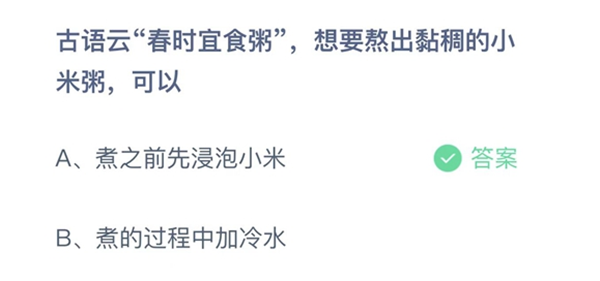 蚂蚁庄园2月20日答案最新问题1:古语云“春时宜食粥”,蚂蚁想要熬出黏稠的庄园最新小米粥,可以?月日 答案:煮之前先浸泡小米 解析:煮粥之前要先浸泡米粒,等它吸饱水分后煮起来更软烂。答案