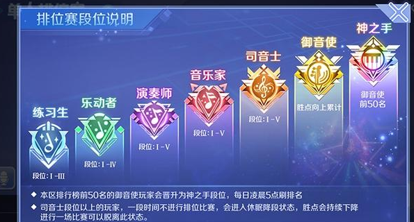 qq炫舞排位赛段位现在分为练习生、乐动者、演奏师、音乐家、司音士、御音使、神之手7个一段位。此中每一个段位下全都有多少的小分段,游戏玩家经过参加排位赛便可获取胜场,堆集胜场便可提高自身的段位。此外仅有本区排位前50的游戏玩家,次能够晋升为神之手的段位。