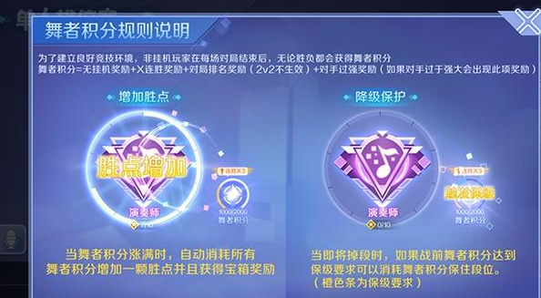 此外QQ炫舞手游排位赛每局参加的游戏玩家,还能够获取特定的舞者积分,舞者积分=无在线挂机奖品+x连胜奖品+战局排位奖品。当游戏玩家的舞者积分涨满的时候,主动损耗全部的舞者积分,增添一枚盛典并获取箱子奖品。