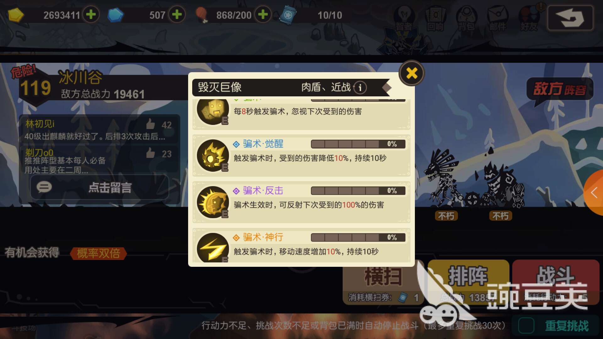毁灭巨像相比下,技能就有些看缘分了。8秒一次得无敌和反射,有时候可以只抵挡一点点皮毛的小伤害,有时能免疫一次敌方后排的技能甚至反而反死敌人后排。总结:在毁灭巨像触发骗术的时候尽量不要让后排先攻击毁灭巨像。