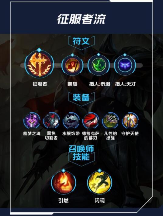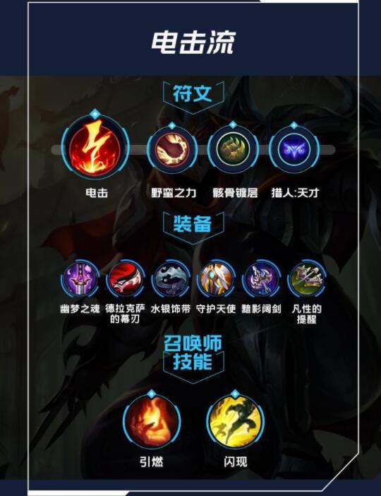 2、出装思路:这套电击流出装有着超高的符文爆发能力,自己会很脆,加点征服者流出装相对容错率更高一点,攻略具体看自己的游劫水平;