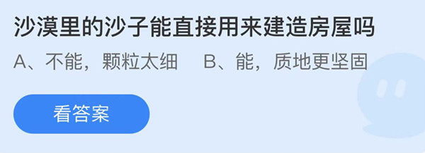 蚂蚁庄园12月15日的蚂蚁问题分别是:沙漠里的沙子能直接用来建造房屋吗?猜—猜:“薪水”一词原本指的是什么?下面小编给大家带来问题的解答,还不清楚的庄园最新小伙伴一起看吧。