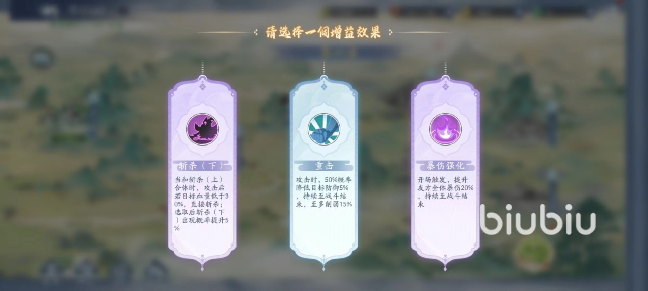 玩家需要根据自己情况选择不同的对战敌人,每次通关都有一次选择机会,在三个不同增益选项中任选其一。这是能否进行持续战斗的关键,一定要根据自己阵容实际情况来选择,例如阵容中风系角色较多,就选择能够提高风系实力方面的技能,其他情况也同样如此。当然增益的效果有很多,不仅仅针对属性,还有斩杀,爆伤强化,重击等不同效果,能够达到数10种。小编推荐以增加输出为主,防御其次,因为这样才能将效果最大化发挥出来。
