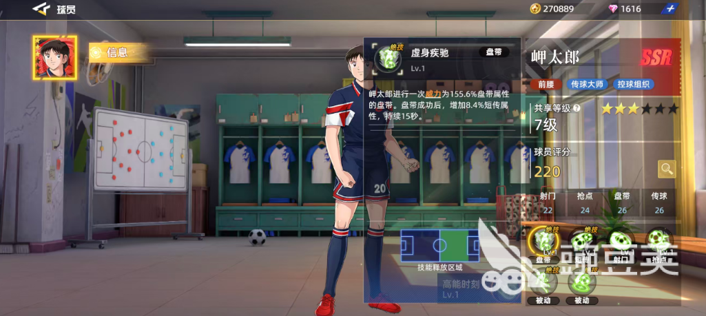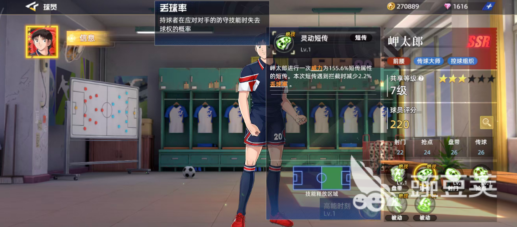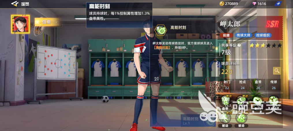 虽然这个数值比较低,但是可以根据我方目前的攻势数值带来一定的额外增加,在我方攻势类型的数值上面高于90%的时候,他在盘带属性上面,根据轻盈律动这个被动还可以额外增加3.5%的百分比,那么在最后一个被动效果上面,岬太郎可以利用的是默契传达这个技能,这个技能给贾太郎带来的是短传水晶的提升效果,其中增加了3.5%的提升效果之后,他只要发动一次短传的动作,那么只要队友成功的接住这个球,此时就可以给他自身恢复0.4%的控制值,所以他在球场上面的控制效果还是可以慢慢提升起来的,最后他在高能时刻这个效果上面可以发动传球绝技,而且此时我方接球球员可以进入一个高能的时刻当中,持续8秒的高能时刻是会为我方球员带来持球时的优势,此时每1%的控制属性效果都会增加1.3%的盘带属性。