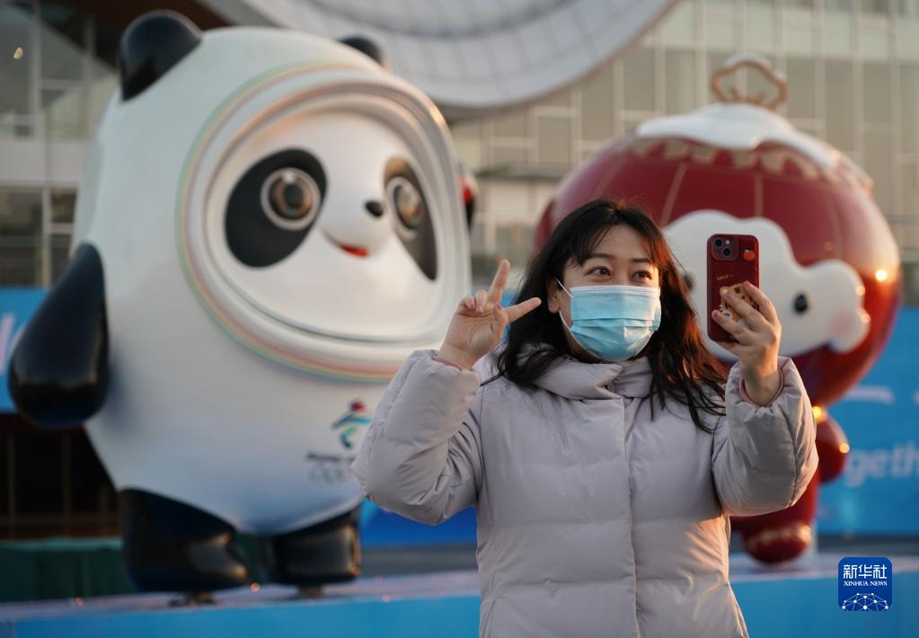 1月29日,一名女士在京张高铁延庆站外的冬奥景观前拍照留念。新华社记者任超 摄