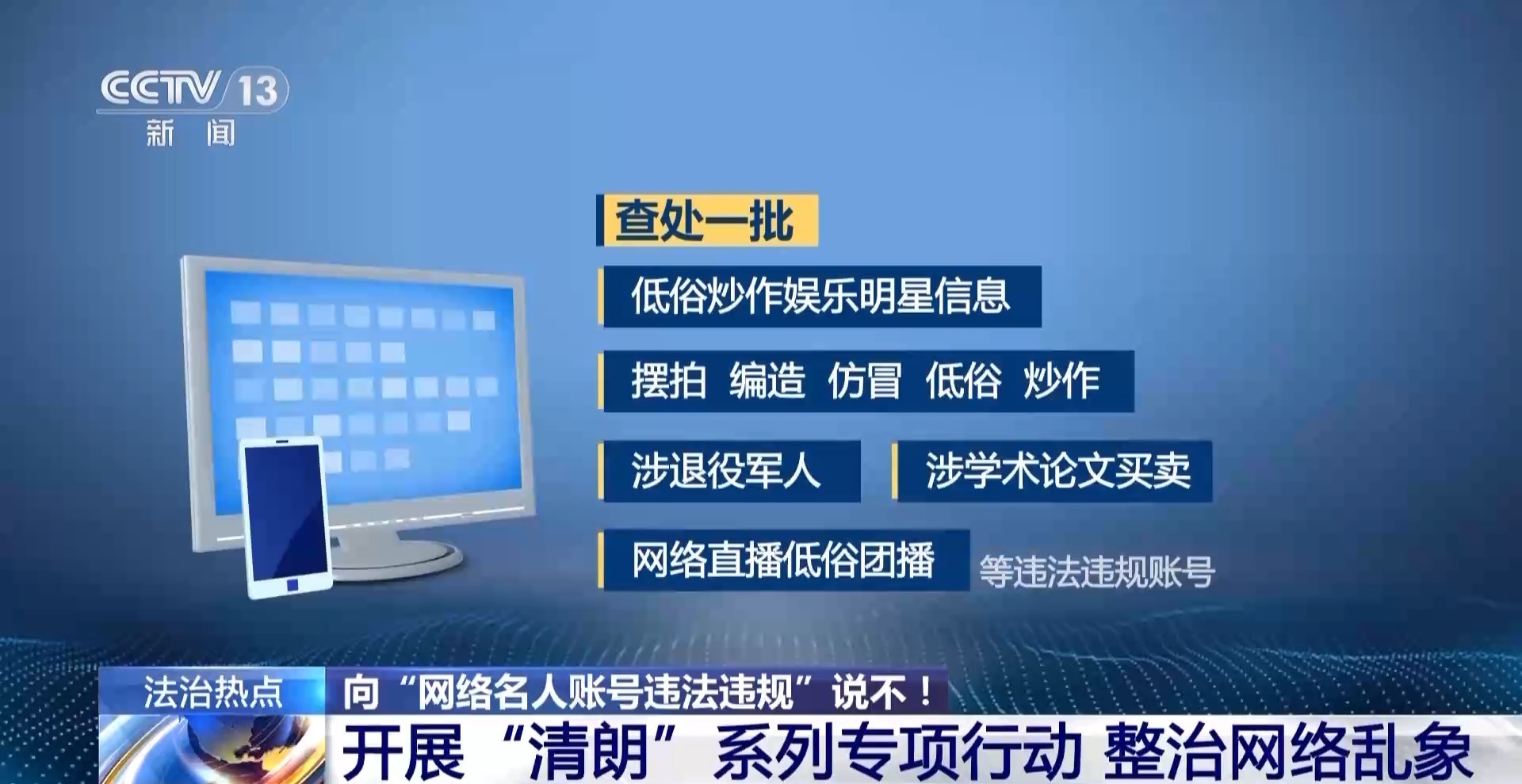 查处一批低俗炒作娱乐明星信息、摆拍、编造、仿冒、低俗、炒作、涉退役军人、批涉学术论文买卖、网络直播低俗团播等违法违规账号。