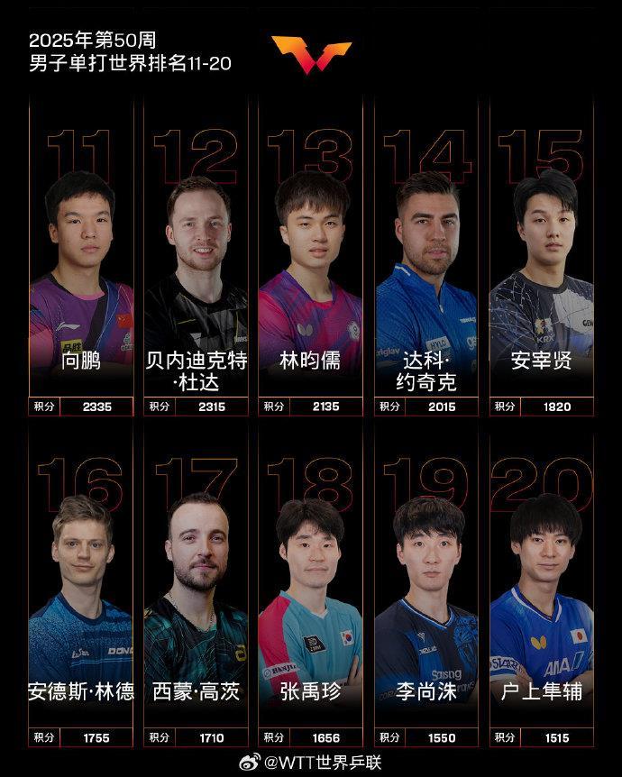 12月9日,国际国际乒联公布2025年第50周世界排名。乒联