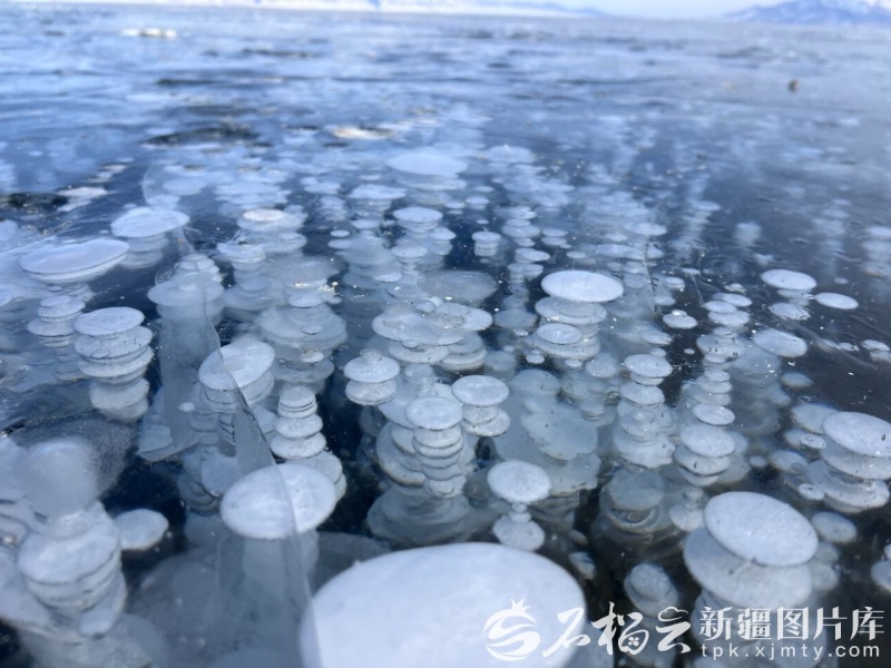 新疆的冬日,是雪与湖的浪漫邂逅。往日里碧波荡漾的赛里木湖湖面,冬日化作厚达数米的蓝冰,澄澈得能望见水下的砂石。最令人惊叹的是那些镶嵌在冰中的 “冰泡”,无数大小不一的气泡层层叠叠,有的如珍珠串连,有的如银河星点,有的聚成朦胧的云团,这冰泡的灵动,为静谧的冬日增添了生命的气息。