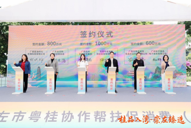 在全场嘉宾见证下,崇左市企业与大湾区采购商完成签约。其中,广西天添乳业有限公司与湖南爱迪商贸有限公司签订年度供货协议,合作意向金额800万元。各协作县均达成企业合作签约,涉及农产品供销、农文旅项目开发等领域,为两地长期合作奠定基础。