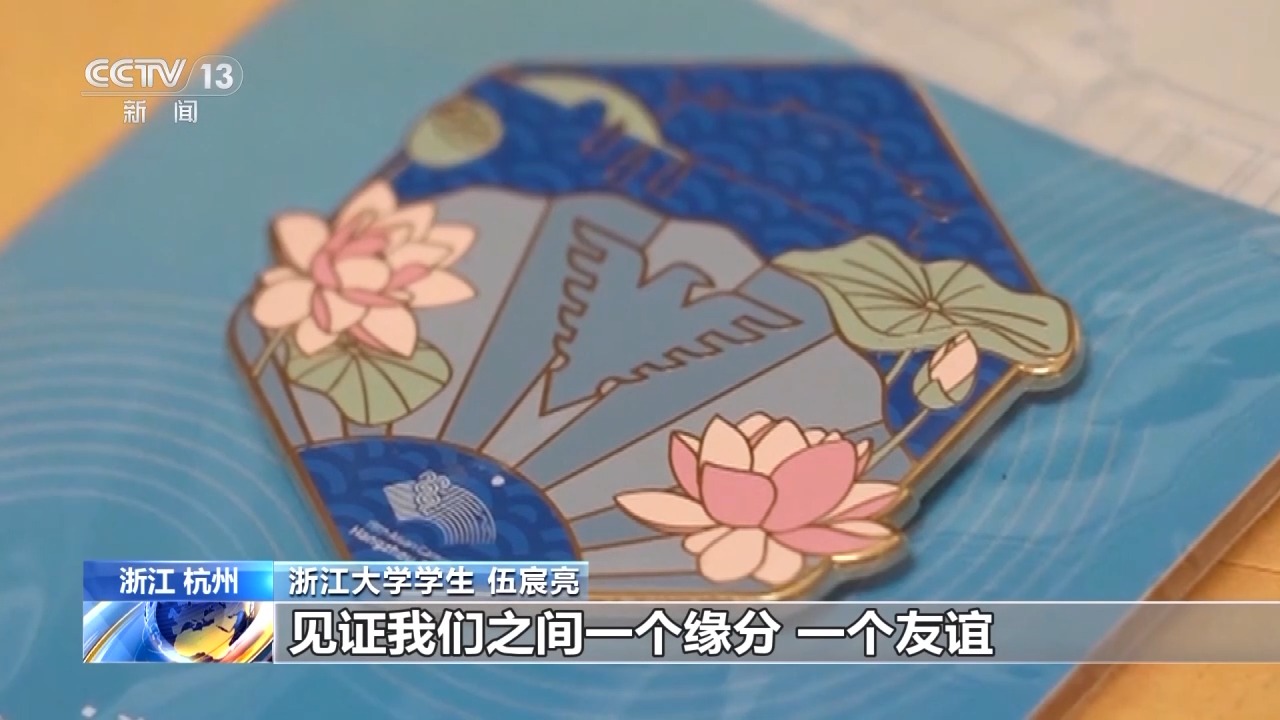 浙江大学学生 伍宸亮:这个徽章是浙江大学在去年的杭州亚运会、亚残运会期间为志愿者设计的一个专属的徽章,在徽章设计的过程中,它是全由我们同学自己设计的,也希望以这枚徽章,见证我们之间的缘分和友谊。