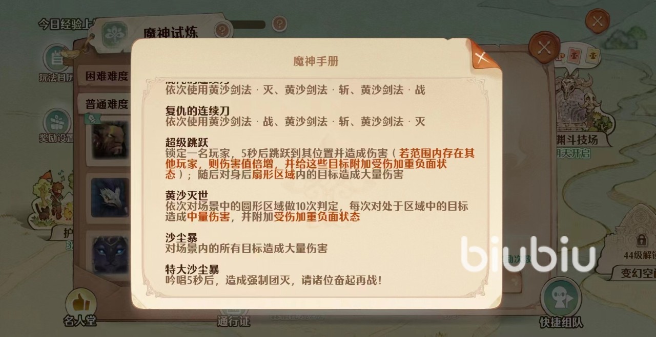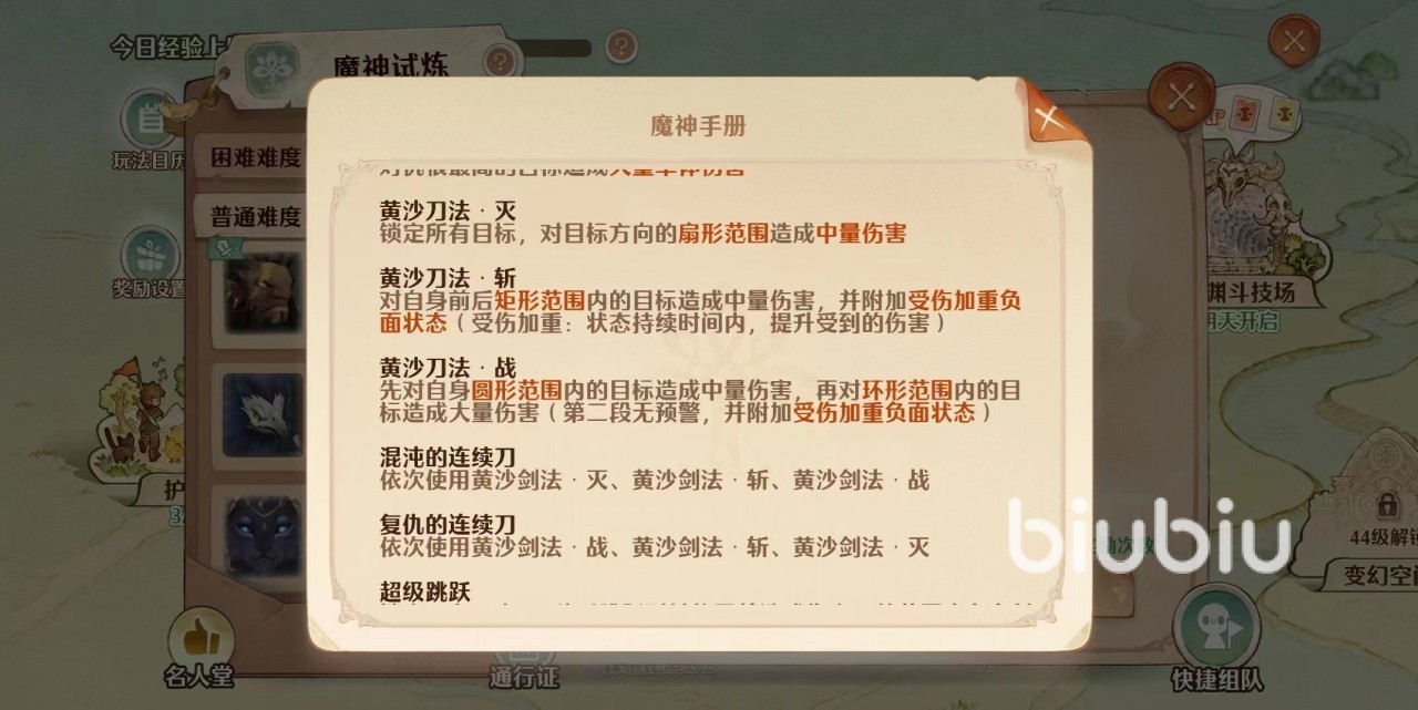 在技能上1技能死刑:能够给范围内的玩家们给予中量的伤害,出现扇形范围的时间注意躲避和后退;2技能黄沙刀法:这个技能有多种形态,都是范围型的攻击伤害,玩家们注意闪避。如果有队友失血过多记得随时加血。