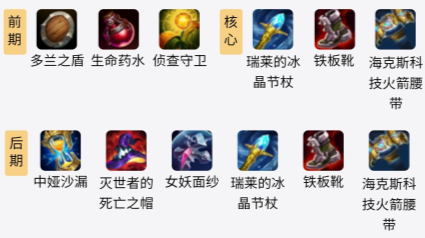 中期:先出面具增加生命值和法術(shù)強度以及冷卻縮減,面具在新賽季里也是一件神話裝備,他的神話被動是增加冷卻縮減,再出中婭的沙漏因為蘭博被動熱量滿了之后會有一段時間之類無法使用技能。