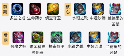 后期:先出振奮增加一點坦度,然后在出一件煉金科技純化器來限制敵方的回血效果,,最后惡魔之擁可以對敵方造成最大生命值的百分比傷害。