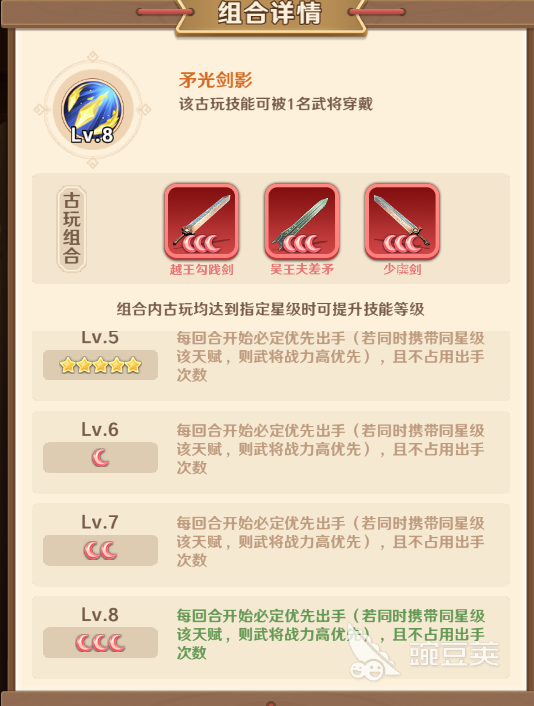 第二套组合是由虢叔旅钟、虎戟镈和成周铃三件古玩激活的。激活之后武将上场就会获得一个叫同生的状态,这个状态的效果就是当武将血量归零的时候,只要场上还有另外一个带同生状态的武将活着,那这个武将就不会死。血量归零之后同生状态会变成共死状态,同时会让另外一个同生武将的血量直接回满,不过这个回血效果一场战斗只能触发一次。等到下一回合的时候共死状态又会变回同生45%状态,并且还能恢复45%的生命值。这套古玩的核心就在于能让两个武将互相保护,大大提高了队伍的生存能力。建议把这套古玩分别给队伍里面最重要的两个武将佩戴,一般来说就是主力输出和主力辅助。这样的话即使对面集火其中一个,另外一个也能把他救回来,保证队伍能一直保持战斗力,持续输出。