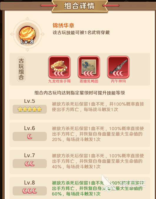 第三套组合需要九龙戏珠手镯、莲塘乳鸭图和丙午神钩三件古玩。激活之后的效果非常霸道,就是当武将被敌方1打死的时候不会真的死,会保留1点血,然后直接反杀对面那个出60%手的武将,并且自己还能恢复到60%的血量。每场战斗这个效果能触发一次。这个效果可以说是保命加反杀二合一了,特别适合给那些输出很高但是比较脆的武将佩戴。让这些武将佩戴之后就不用太担心被集火秒杀,反而还能利用这个机会反杀对面的关键武将。建议给队伍里面的第二或者第三输出武将佩戴,因为主力输出一般会受到重点保护,反而是这些副输出容易成为对面的目标。