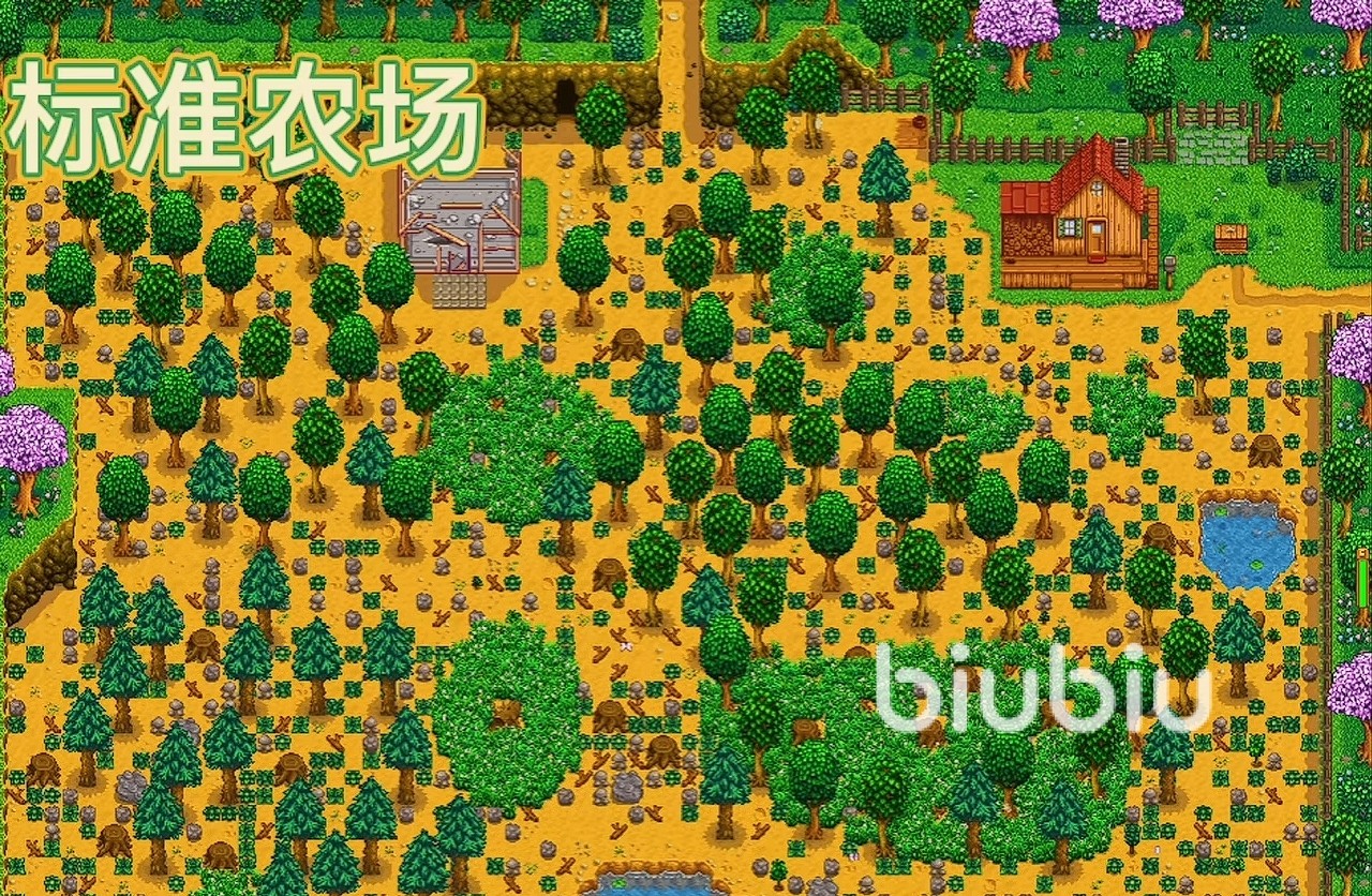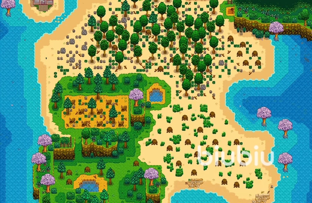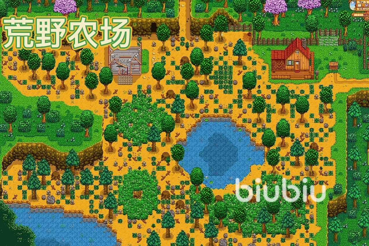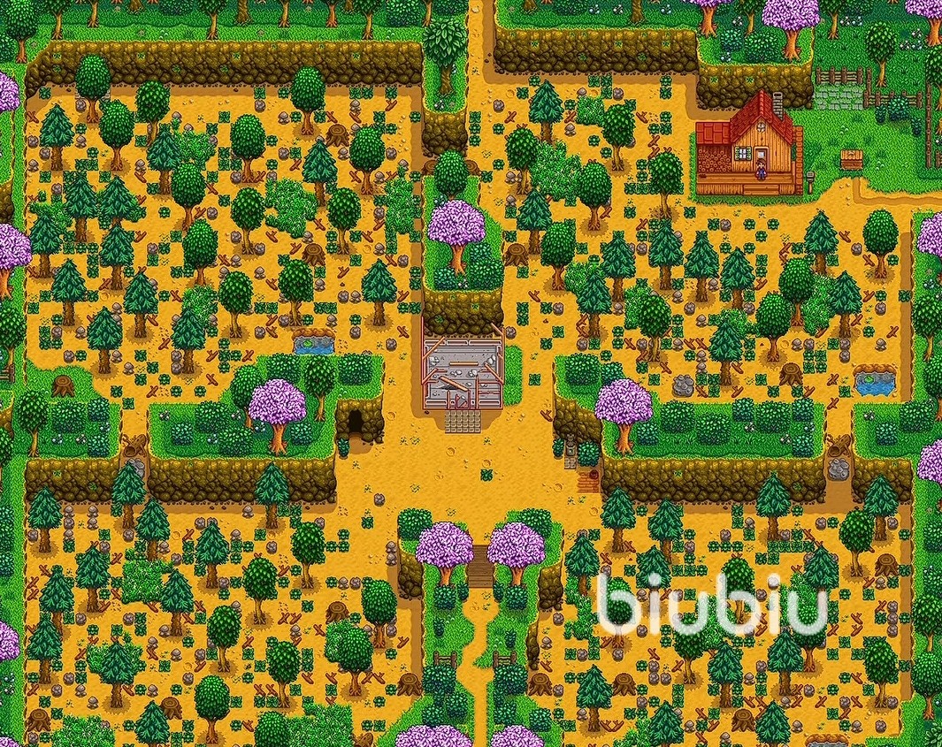 顾名思义,这个农场的整体布局被四个角进行完全的区分开来,每个角落都可以单独视作一个标准的小型农场区域,非常的公平。因此,十分推荐各位玩家朋友们今后连机作为地图的选择。到时候四个人,一人一小块区域进行合理的规划即可。进每个区都有水源以及植物,草丛的分布。当然,玩家们也可以在四片区种植四种截然不同的作物,然后再进行规划即可。