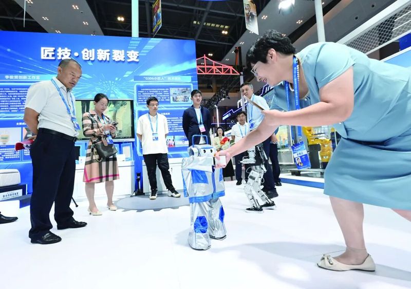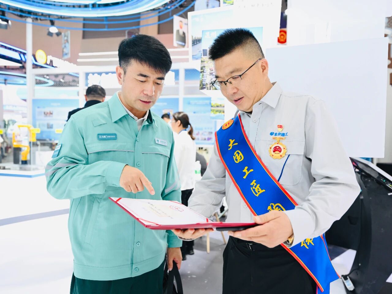 展会现场,大国工匠王月鹏、约新陶建伟围绕技能成才、匠心京报技能报国之路深入交流。赴创