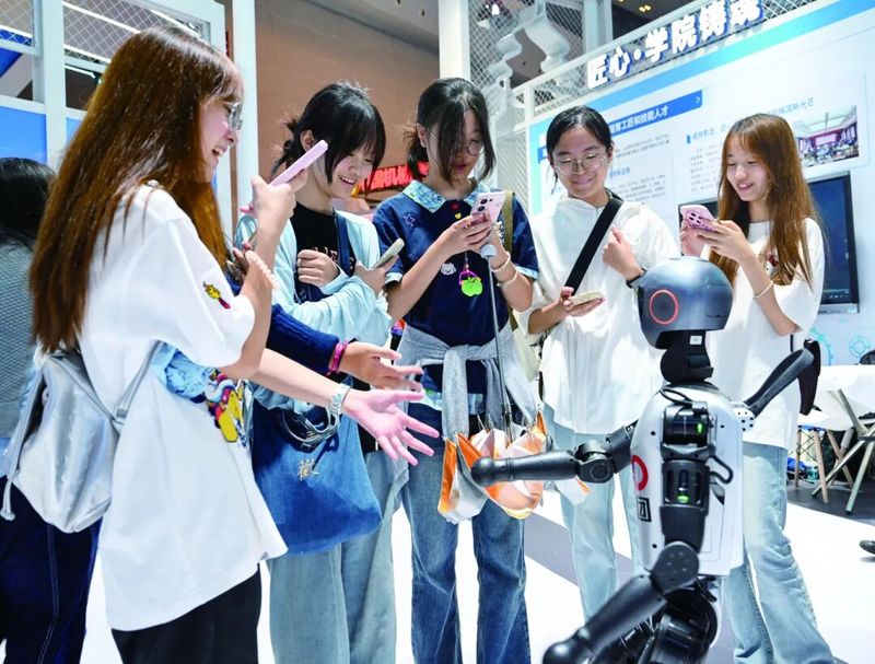 人形机器人吸引了参加研学活动学生们的关注。