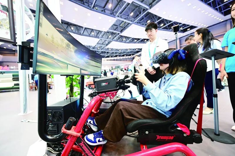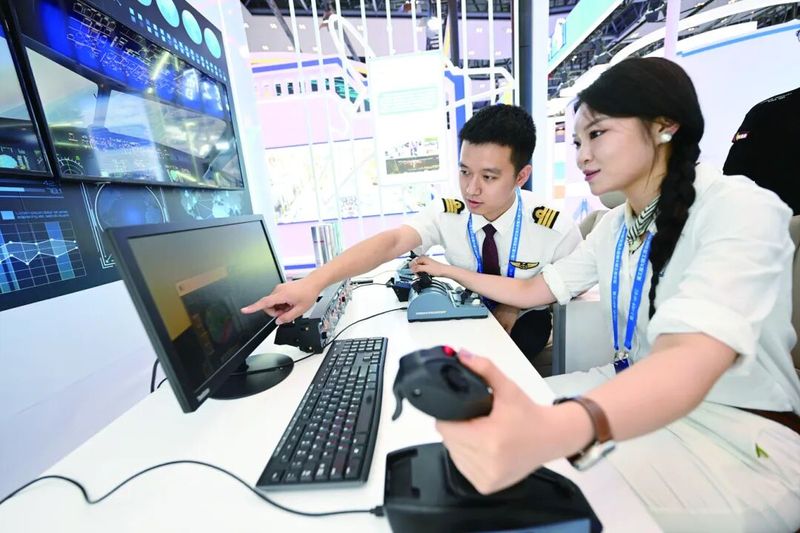参观者体验模拟驾驶飞机。