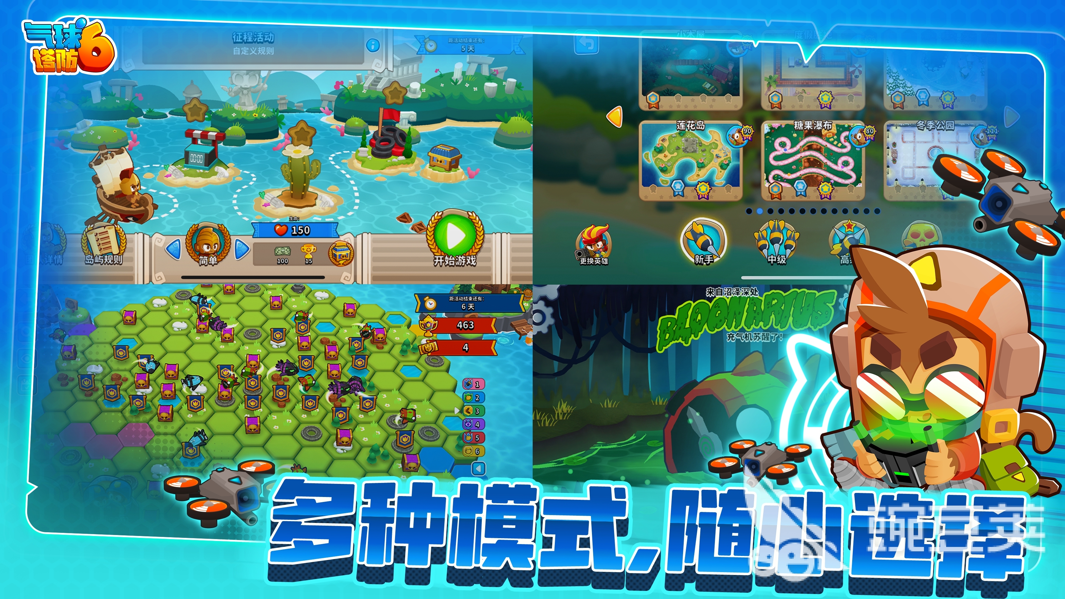 这是一款好玩的塔防防御游戏,和可爱的猴子一起守卫家园,爆笑的战斗过程,能够带给玩家很多欢声笑语,搭配灵活的沙盒地图创造玩法,能够自由发挥想象力,建造出不同功能的塔防攻击敌人,而且满屏的气球营造出不同的浪漫氛围,丰富的地图都是激烈战场,山丘、街道大陆和海滩等都能自由作战。