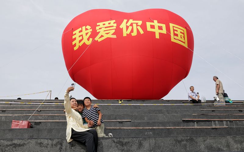 还记得去年燕景台飘扬的五星红旗吗?今年,南苑森林湿地公园燕景台设置“打卡燕景台·我的中国心”巨型气膜装置,众多游客站在气膜装置前留影。
