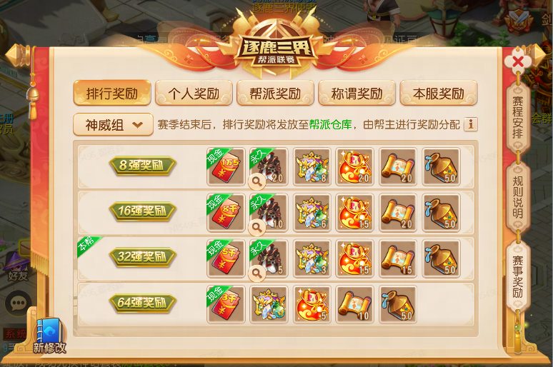 (1)现金奖励:进入淘汰赛的帮派均可获得现金奖励,总奖金额提升超50%,瓜分超百万现金奖池!本届比赛将在赛后由帮主在游戏内进行分配发放。