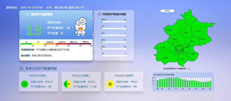 据北京市生态环境监测中心今早7时数据,目前实时空气质量指数13,空气质量优。