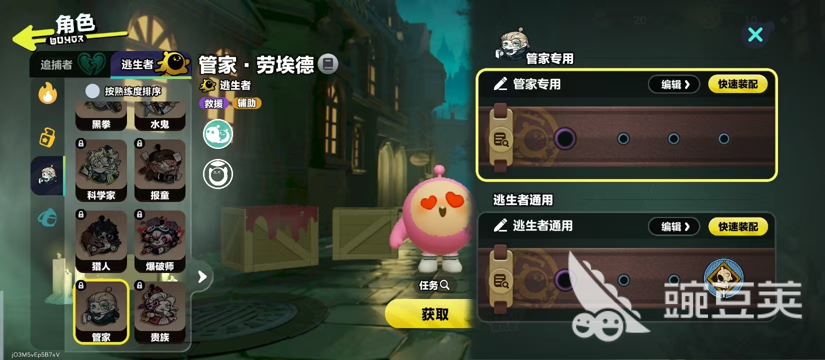 而这一个角色在获取时有三种不同的方法,首先可以通过局内的战斗还有日常任务去获取惊魂矿。这种货币就能够去购买,管家所需要的数量是600个,如果玩家觉得这个方法有一些复杂,也可以选择通过酷乐币购买,同样只需要600个,相对比较简单。通过任务也可以获取,例如扮演逃生者获胜5场之后马上就可以解锁,通过实战积累也可以免费的将它纳入到阵容中,对那些喜欢逃生玩法的玩家而言。这一个解锁方法还是很有趣味性的。
