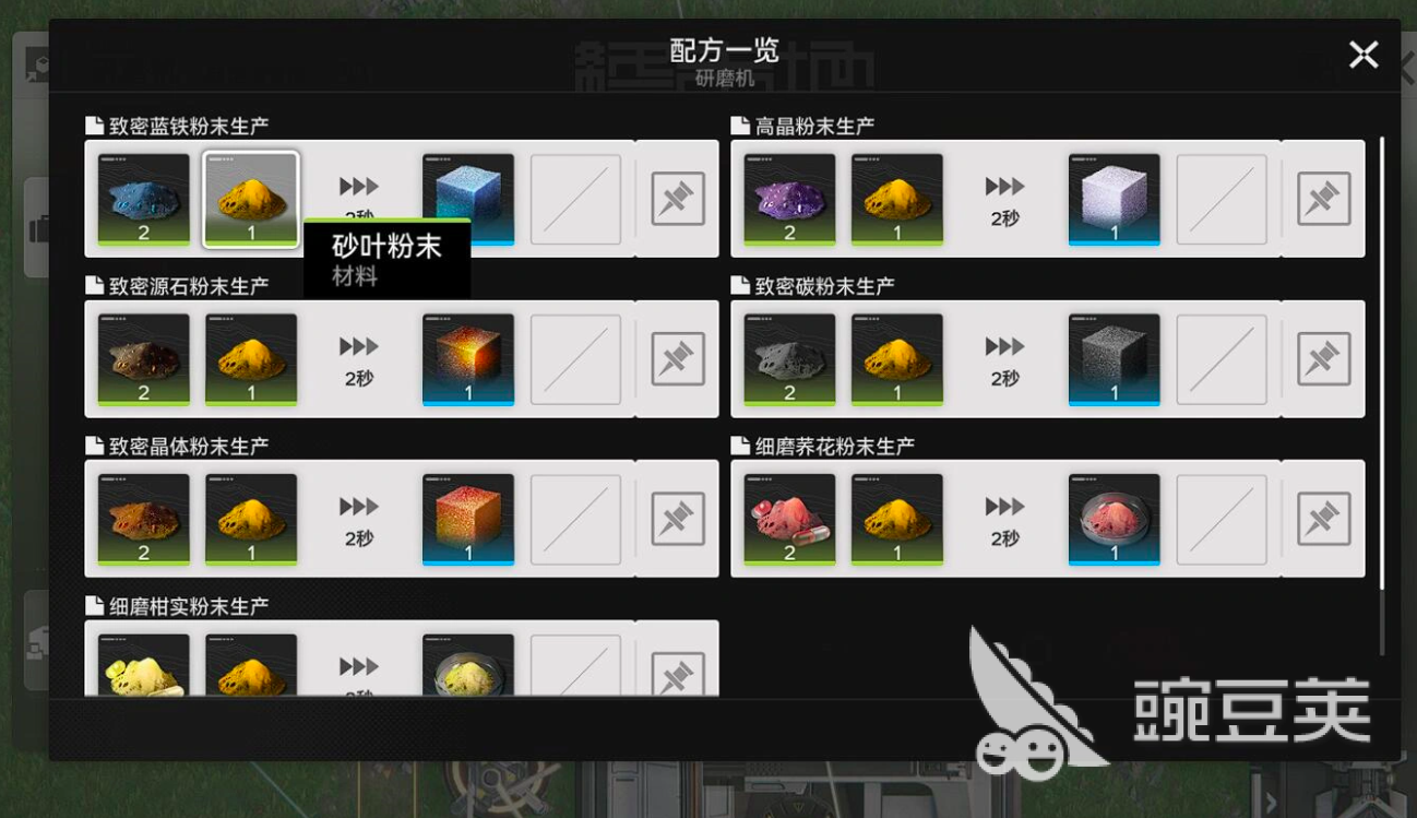 而砂叶获取后并不是直接使用的,而是需要玩家利用研磨机将砂叶加工成砂叶粉末,才能够进一步的进行各种高级配方的合成和基建的快速升级,在游戏当中,一份砂叶可以制作出三份粉末,每一次的砂叶粉末加工时长为2秒,玩家可以直接使用三台机器共同生产,直接使用一条传送带进行资源传入即可。小技巧:一定要保持传送带进入到负载均衡的状态下,而且部分特定干员能够让研磨机的工作效率提升10~15%。