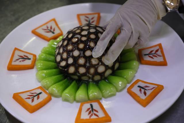 59名黑龙江名厨用西牛麻竹笋与黑土优品碰撞新型融合东北菜。图为用西牛麻竹笋做的东北“锅包笋”。