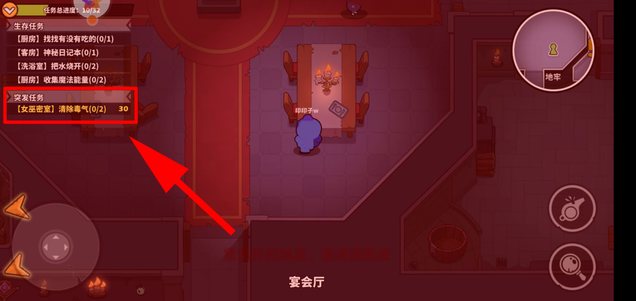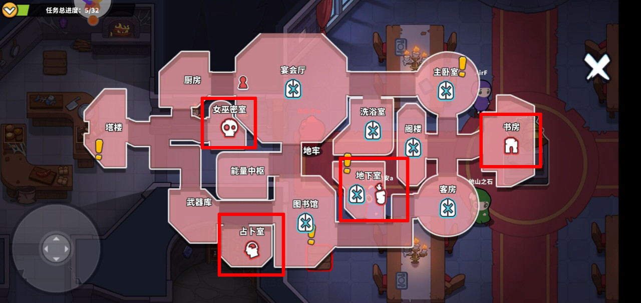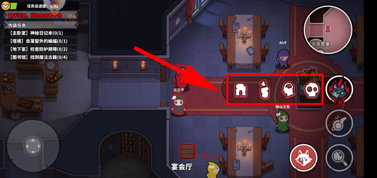 四个破坏选项应对四个平民的紧急任务,任务发生地点分别是女巫密室,占卜室,地下室,书房。记好四个任务的位置,我们可以退提前埋伏在路上,可以更方便对平民下手。