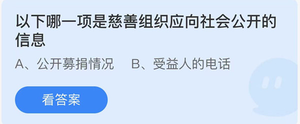 问题2-答案解析: 1、慈善组织是非营利组织,它面向社会公开募捐,再将捐款用到有需要的人身上。 2、所以公开募捐情况和使用情況是必須向全社會(huì)面公開的,讓大家看看錢怎么支配了。 3、包括年度工作报告和财务会计报告、慈善项目有关情况等等信息都要做到公开透明。