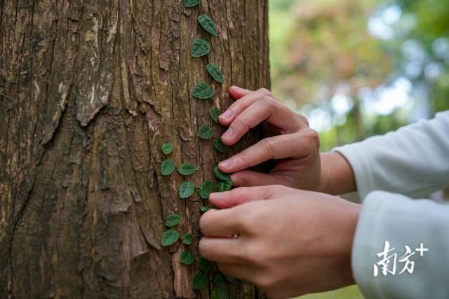 12月4日,许兴群在跑步途中触摸树干上的树叶。