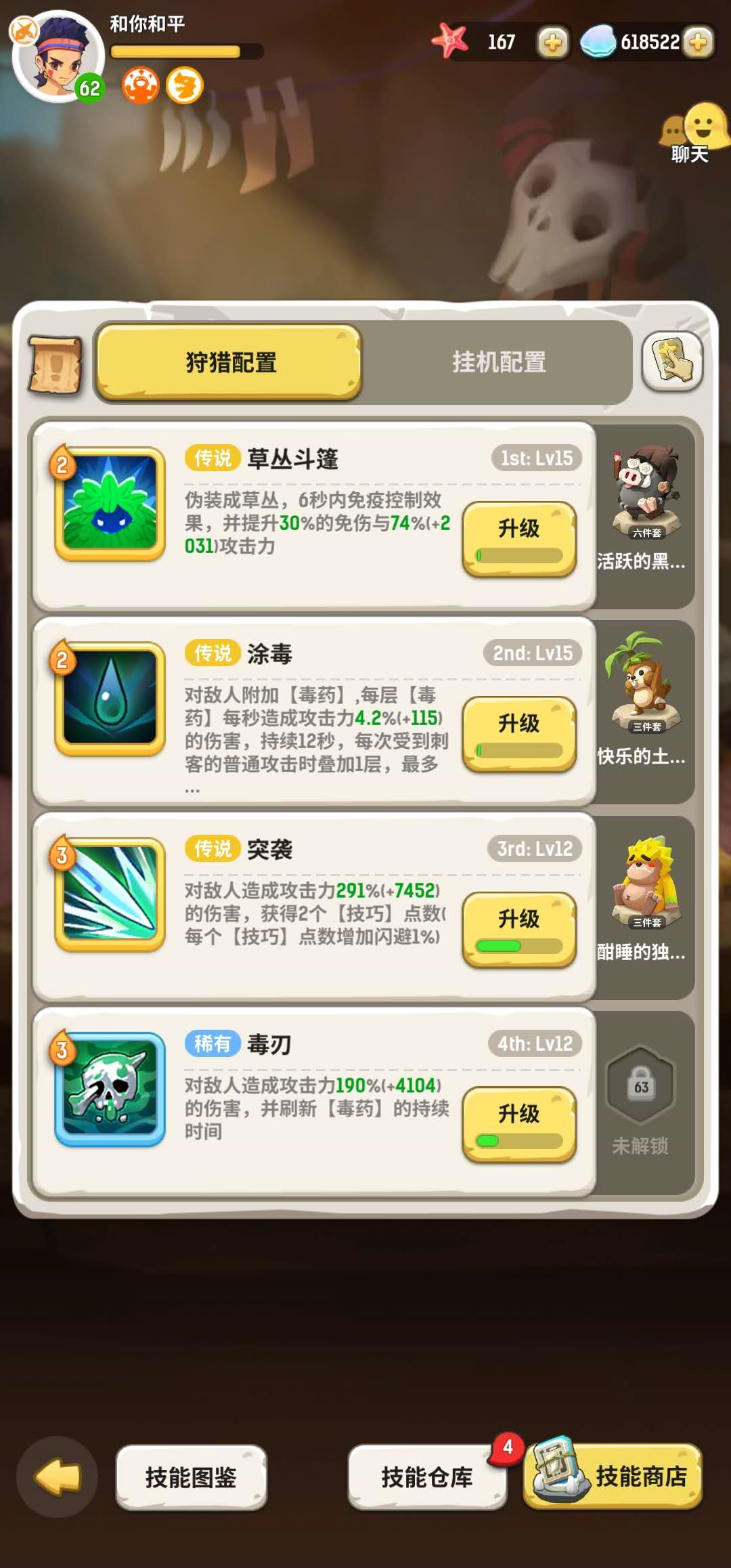 草丛斗篷可以使得自身免疫控制效果,并且在一段时间内提高自身的攻击力。而涂毒可以每秒对敌人造成最大生命值的伤害,这种伤害量是非常可观的。突袭是为了增加自身的闪避率,能够躲避很多的技能伤害。毒刃用来刷新boss中毒的持续时间,保证伤害的充足。