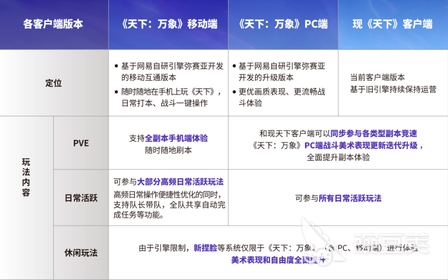 在移动端、PC端和现天下客户端这三端都可以实现PVE、下万象游戏入日常活跃、休闲等多种玩法模式,游戏享受随时随地都会开启。其实本期除了三端互通这个问题,小编还想和大家详细聊一聊在这场发布会上,官方透露出的一些游戏新消息,在《天下:万象》当中不仅包括了《天下3》《天下手游》等一系列经典产品的矩阵模式,而且还做出了一些破局办法,众所周知,像mmo手游的固化标签就是需要长时间、稳定性,但设计方为了”守护“传统大龄玩家们,在游戏当中开启了”经典版+赛季版“的双轨模式。