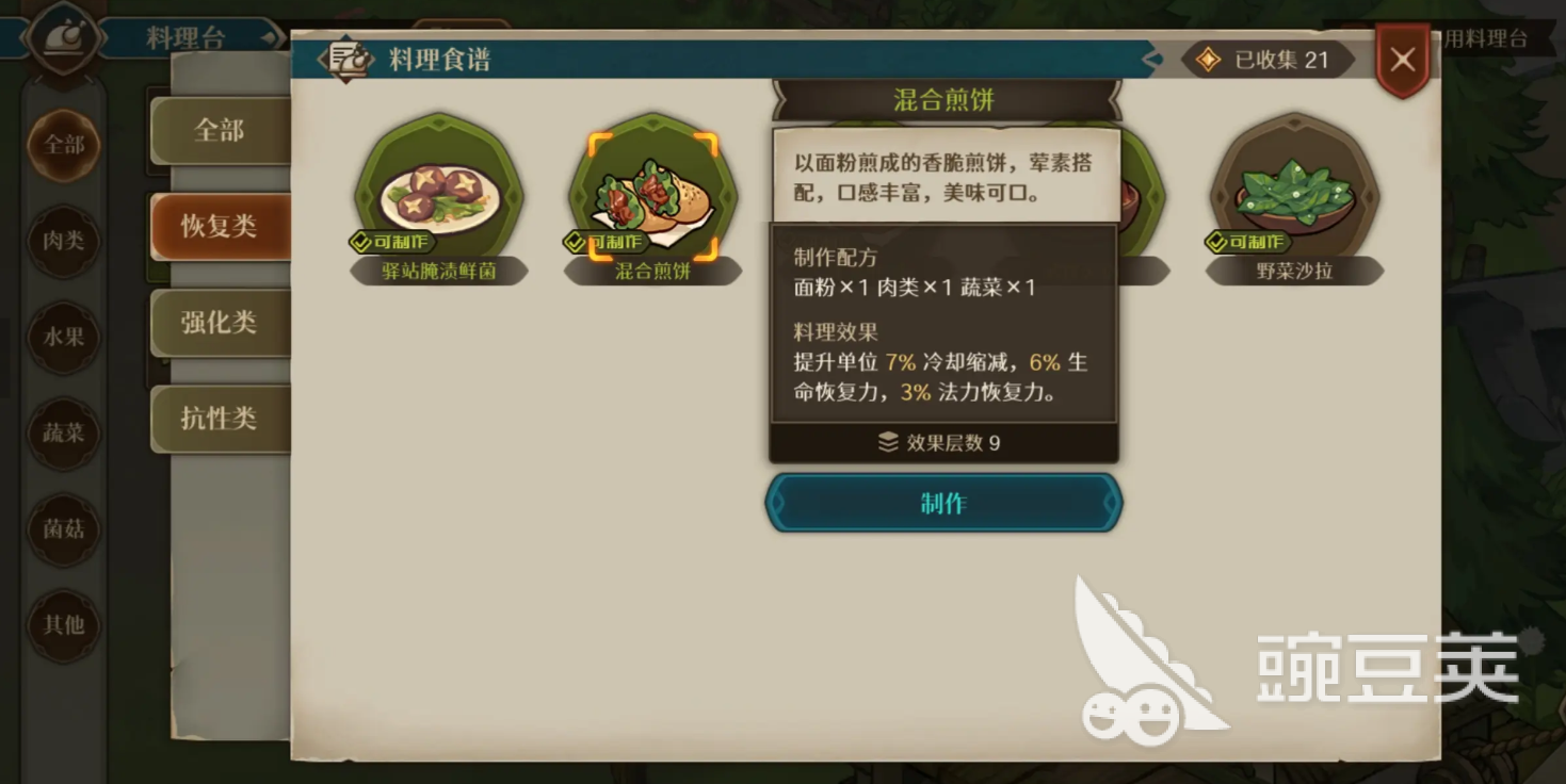 其实在料理方面的话,玩家也需要了解对应的食材,像驿站骨汤火锅。这个其实是由猪腿骨跟肉类食材所组成的,它能够提高物理攻击,也能够提高生命上限,甚至在法力恢复方面也会有不错的增益效果。另外,果酱吐司是由面粉和果酱所组成的,它能够有效地提高物理防御,在生命恢复跟法力恢复方面的效果是非常棒的。如果说玩家所说的混合煎饼,这个所使用的食材就比较多了,像面粉,肉类和蔬菜类的食材,它能够有效的缩短冷却时间。