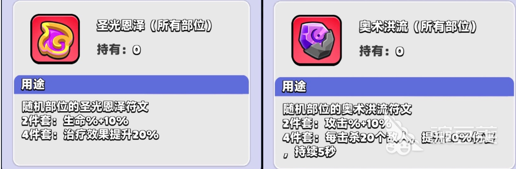 雷系符文圣光恩泽套主要提升生命值和治疗效果,2件套是生命值提升10%,四件套则是治疗效果提高20%,奥术洪流套能提升攻击,2件奥术洪流能使攻击增加10%,四件奥术洪流则是每击杀20个敌人时都能使伤害提升20%,可以维持5秒钟的时间。