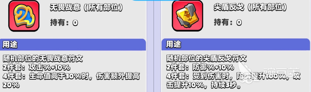 冰系的无畏战意套适合所有的部位,该符文套装在集齐2件套的时候能够增强10%的攻击力,4件套会在英雄的生命值高于30%的时候,自身带来的伤害会额外的提高20%,尖盾反戈套主要效果就是提升防御力,2件套能够使防御力提升10%,四件套石,英雄在受到伤害时自身的防御力会100%的提升,攻击力提供还能提升10%。