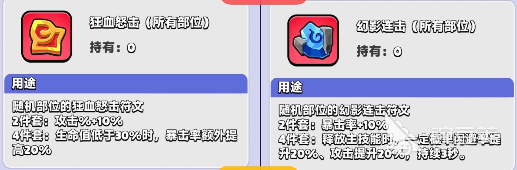 火系的狂血怒击套在装上2件套后攻击力会增强10%,四件套的话会在自身的生命值不足30%时,暴击率额外的增强20%,幻影连击套在装上2件后暴击率能提高10%,司机安涛的话,英雄在释放主技能时,闪避的概率会提升20%,攻击力会提升20%。