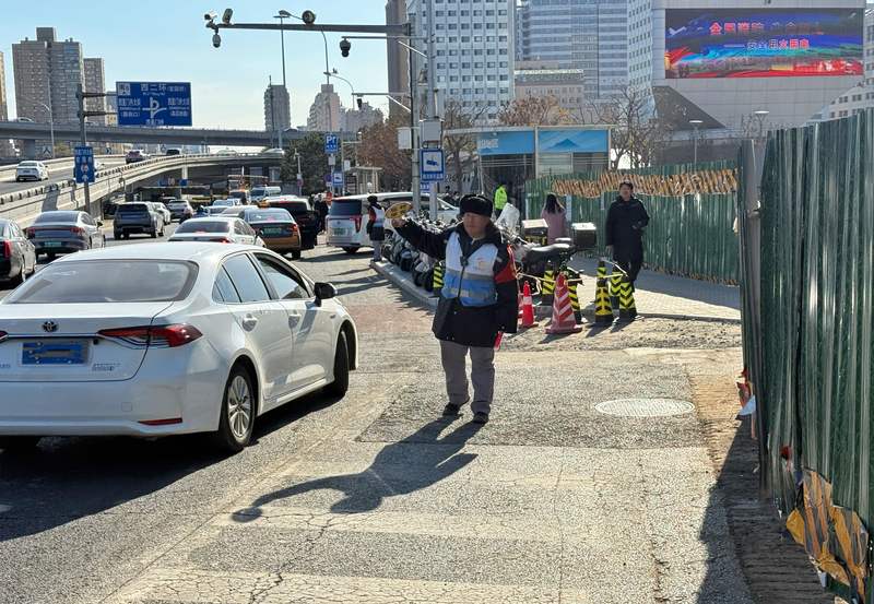 工作人员在施工围挡前指引车辆进入临时落客区。新京报记者 王贵彬 摄